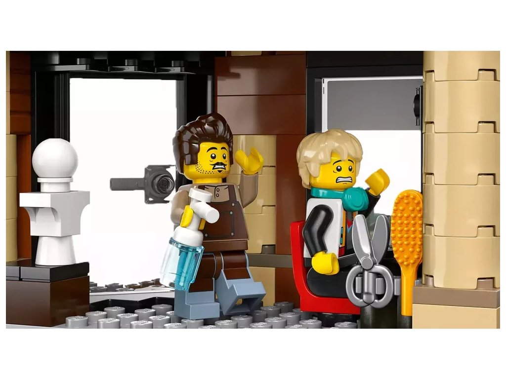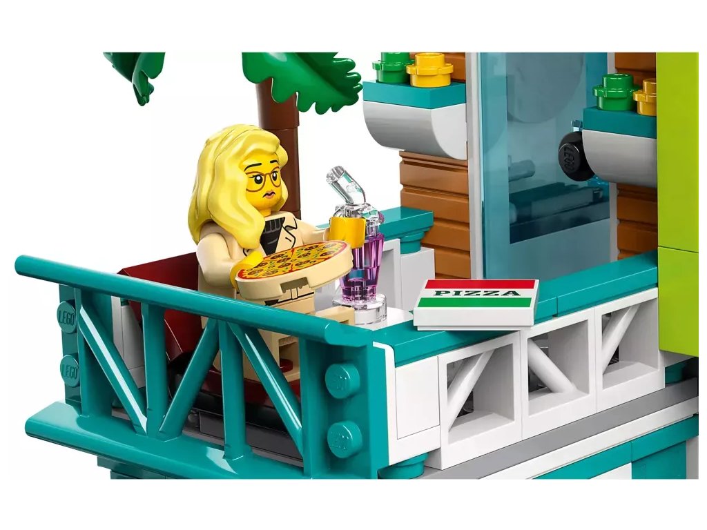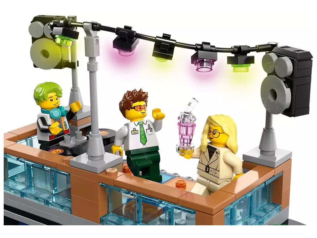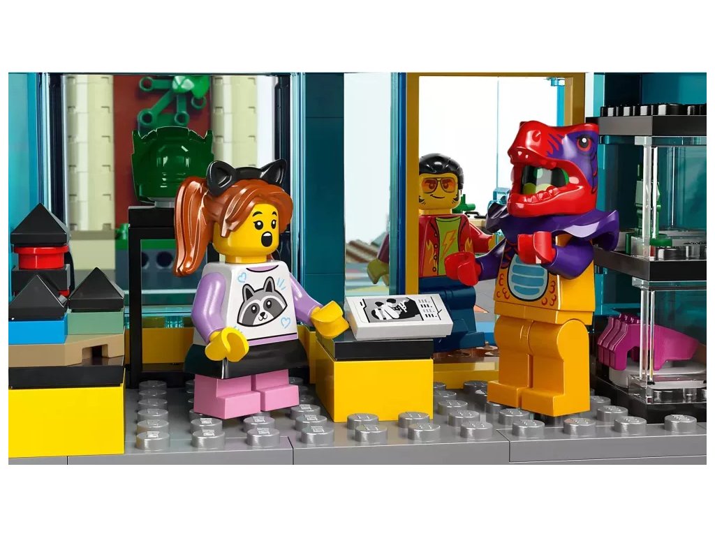 - Co najdete v krabici? – Holičství, veterinární kliniku, blogovací studio, diskotéku na střeše, obchod s komiksy, obchod s elektronikou, úklidovou místnost, hotel, pizzerii, ovocný bar, stánek s nudlemi a 14 minifigurek