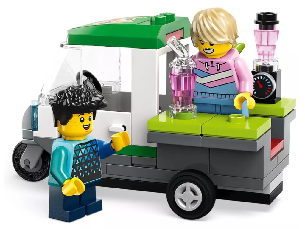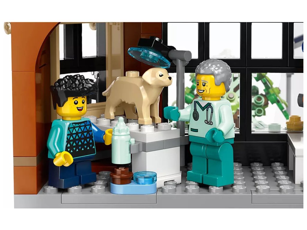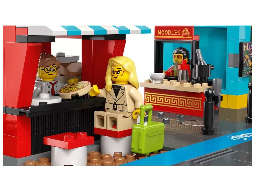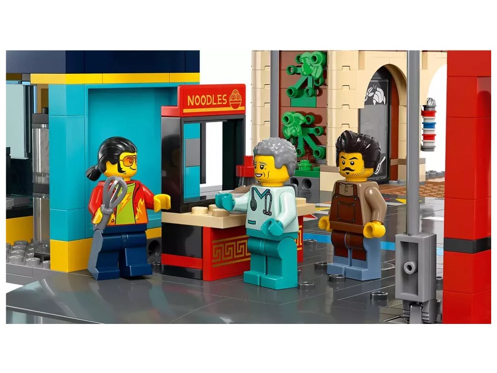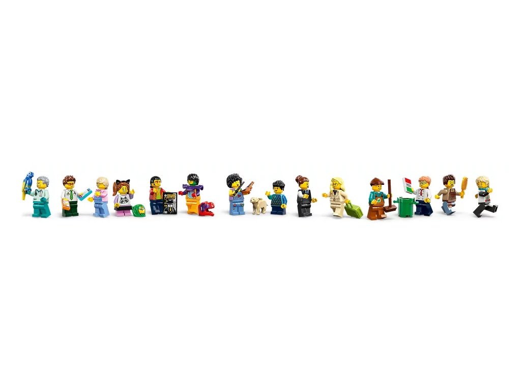 - Co najdete v krabici? – Holičství, veterinární kliniku, blogovací studio, diskotéku na střeše, obchod s komiksy, obchod s elektronikou, úklidovou místnost, hotel, pizzerii, ovocný bar, stánek s nudlemi a 14 minifigurek