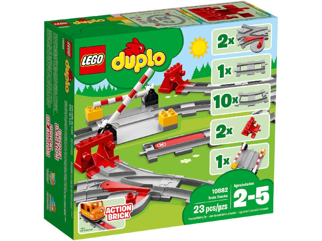 Otevřete dveře nekonečným možnostem a postavte si s vašimi nejmenšími suprovou trať pro vaše nové nebo stávající DUPLO vláčky s touto sadou 10882 Koleje od LEGO® DUPLO®. Díky železničním přejezdům, zastávkám, výhybkám a kombinaci zatáček a rovných dílů kolejí přináší obrovskou porci zábavy! Předškoláci si zamilují i červenou akční kostku, díky které kterýkoliv kompatibilní DUPLO vláček (včetně vlaků ze sad 10874 Parní vláček a 10875 Nákladní vlak) zastaví, jakmile na ni najede.
