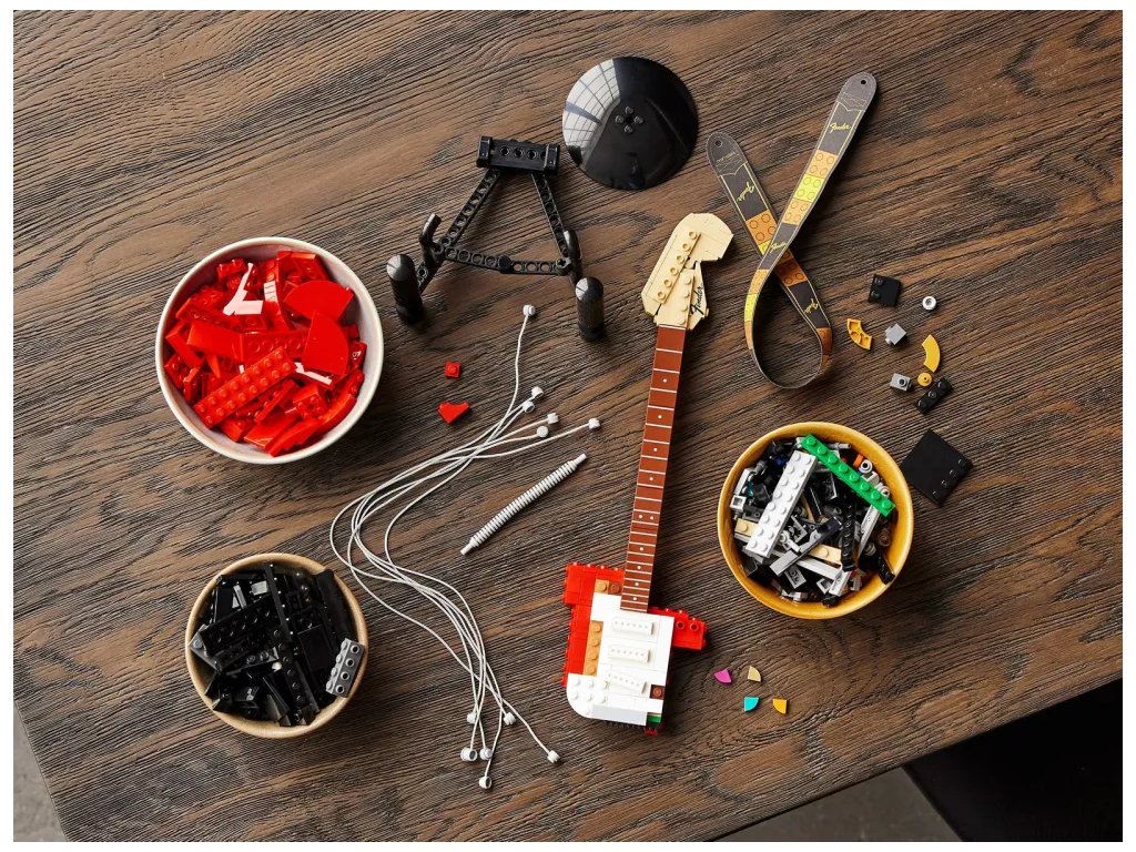 - Součástí sady čítající 1 079 dílků je brožurka s historickými zajímavostmi o kytaře Fender® Stratocaster®, informacemi o autorovi modelu z řad fanoušků a LEGO® designérech a s podrobným návodem na stavění.