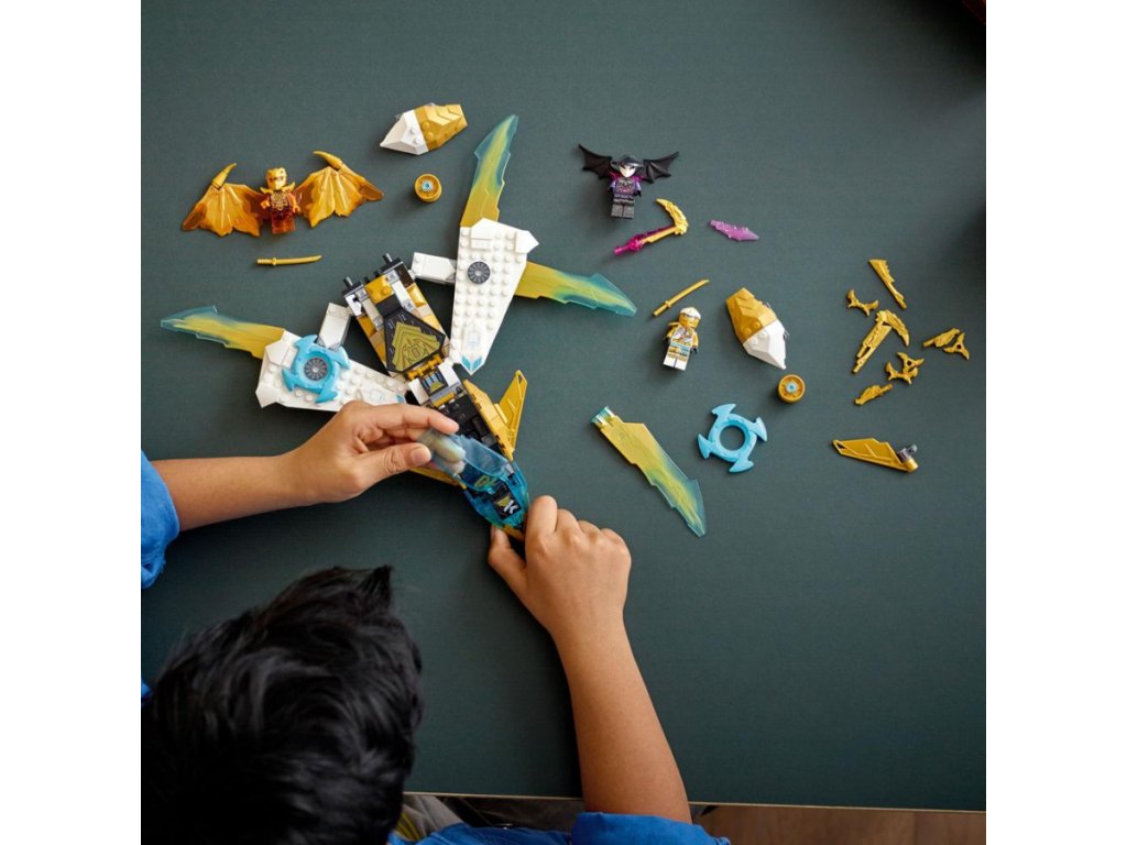 Stavebnice Zaneova zlatá dračí stíhačka (71770) od LEGO® NINJAGO® dětem od 7 let umožní přehrávat si akční scény ze seriálu NINJAGO: Crystallized. Působivá stíhačka NINJAGO zaujme kokpitem pro minifigurky nindžů, ale také zlatými křídly, s nimiž bude vypadat jako létající nindžovská hvězda.
