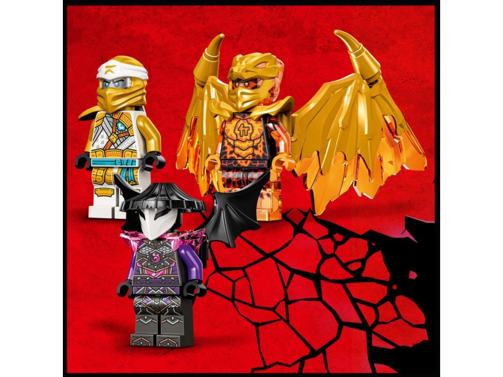 Tato nindžovská stavebnice nabízí 3 minifigurky: zlatého dračího Colea s párem zlatých dračích křídel ozdobených ostny, zlatého Zanea a generála Vangelise. Nic tedy dětem nebrání v tom, aby si přehrávaly strhující bitvy mezi silami dobra a zla v NINJAGO City.