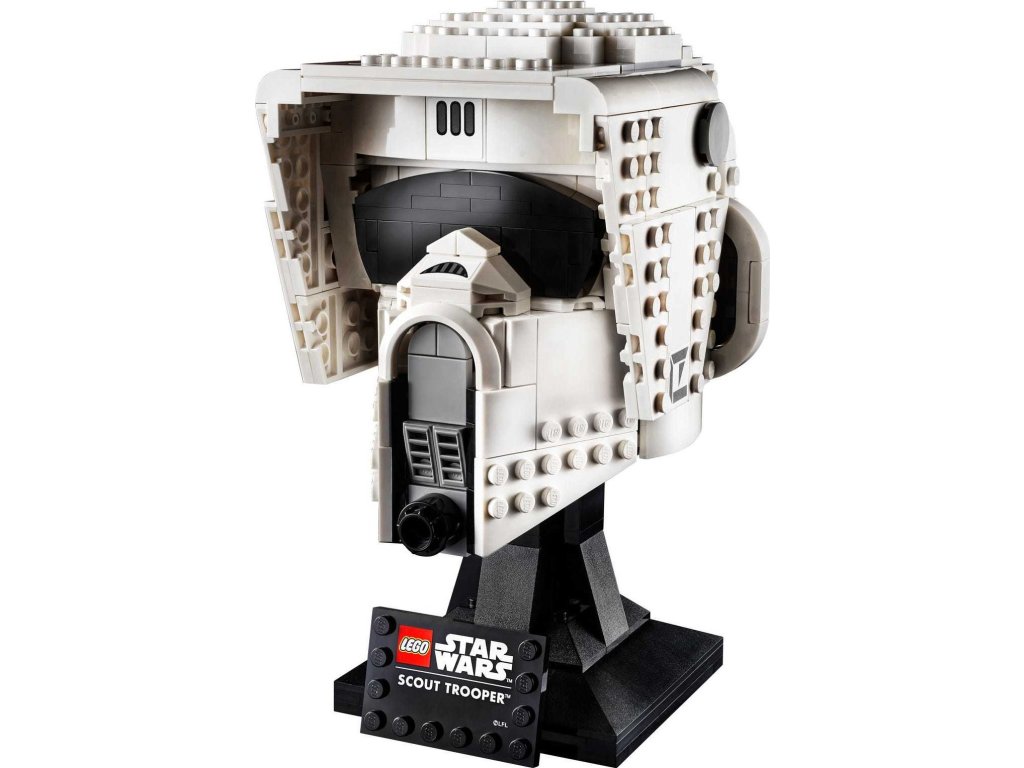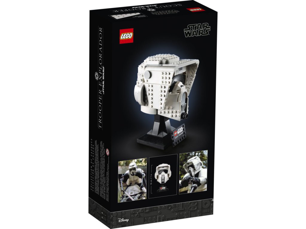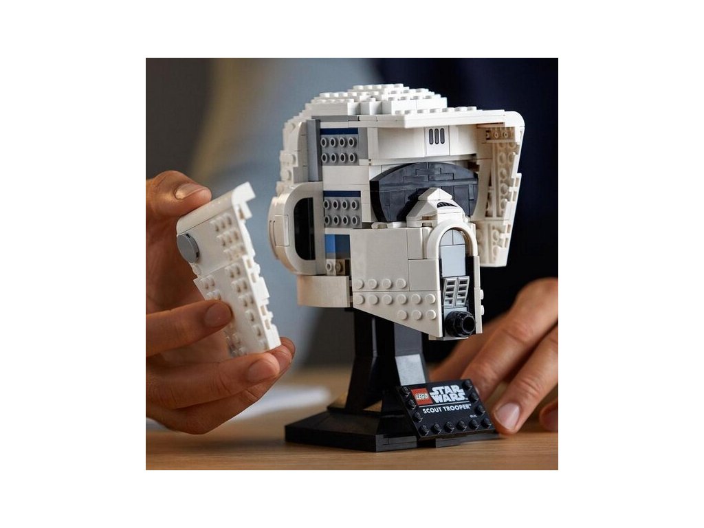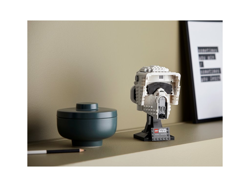 Charakteristický vzhled helmy průzkumného vojáka je vyjádřen pomocí LEGO® kostek a dává vzpomenout na scény ze ságy Star Wars™. A s podstavcem se štítkem bude tento výstavní kus kompletní.
