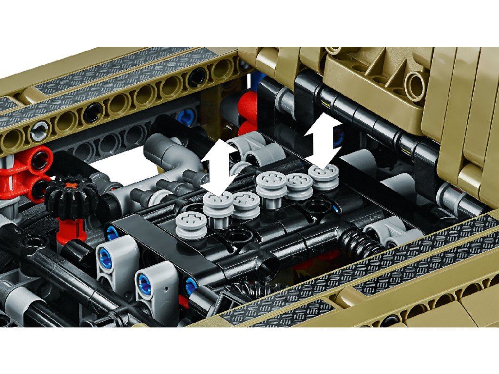 - Převodový systém se 2 pákami pro vysoký nebo nízký převodový poměr a řadicí pákou – systém je novinkou pro říjen 2019 a je dosud nejdůmyslnější převodovkou LEGO Technic!